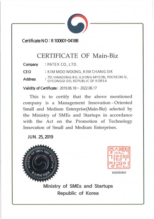 CERTIFICATE OF MAIN-BIZ 페이지 정보 작성자 관리자 댓글 0건 조회 3,163회 작성일 18-06-22 11:07 본문 DATE 2019.06.18 ~ 2022.06.17 CONTENTS Designated as a Management lnnovation Business by the Small & Midium Business Administration,Republric of Korea 내용없음