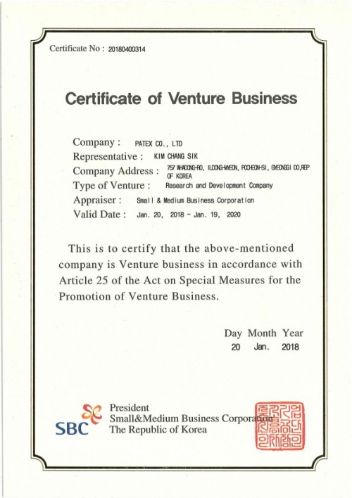 Certificate of Venture Business 페이지 정보 작성자 관리자 댓글 0건 조회 3,635회 작성일 18-06-22 11:19 본문 DATE 2018.01.20 ~ 2020.01.19 CONTENTS Obtain Certificateion 내용없음